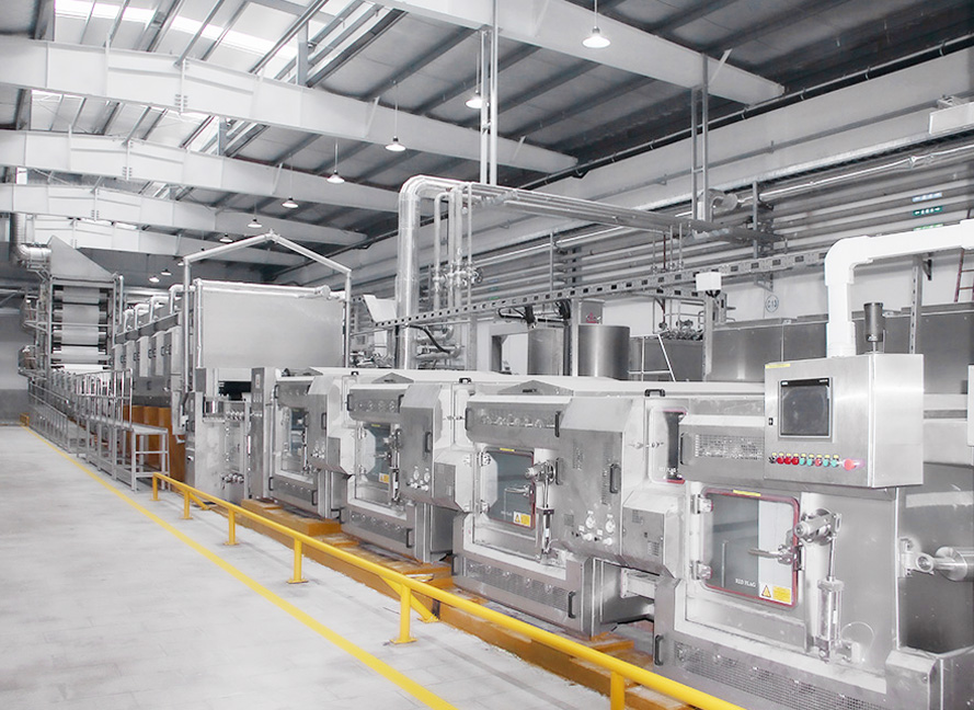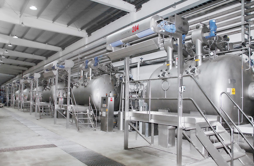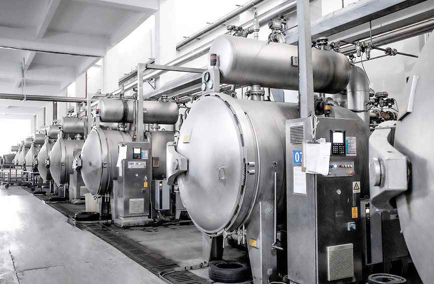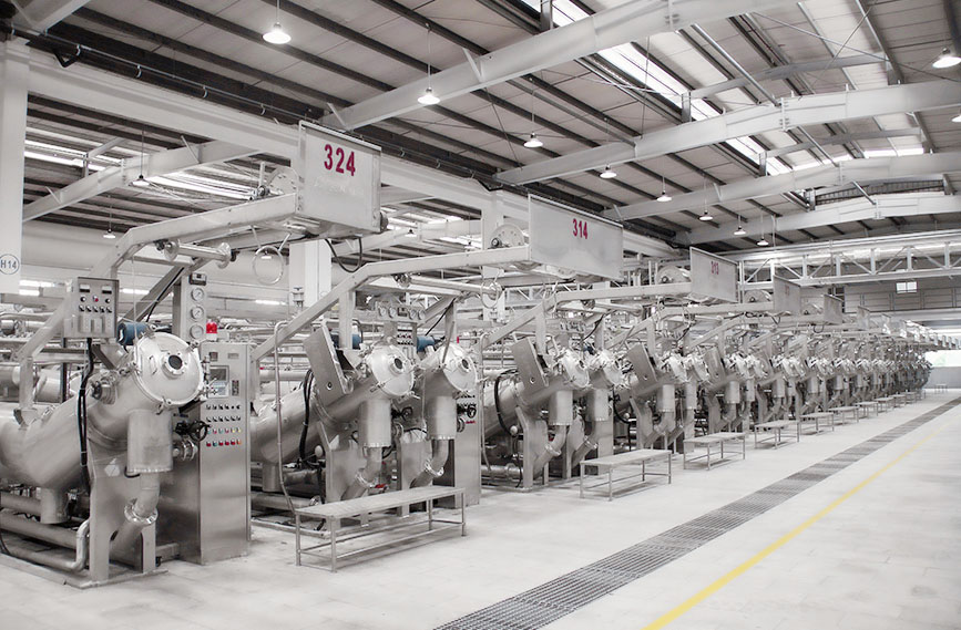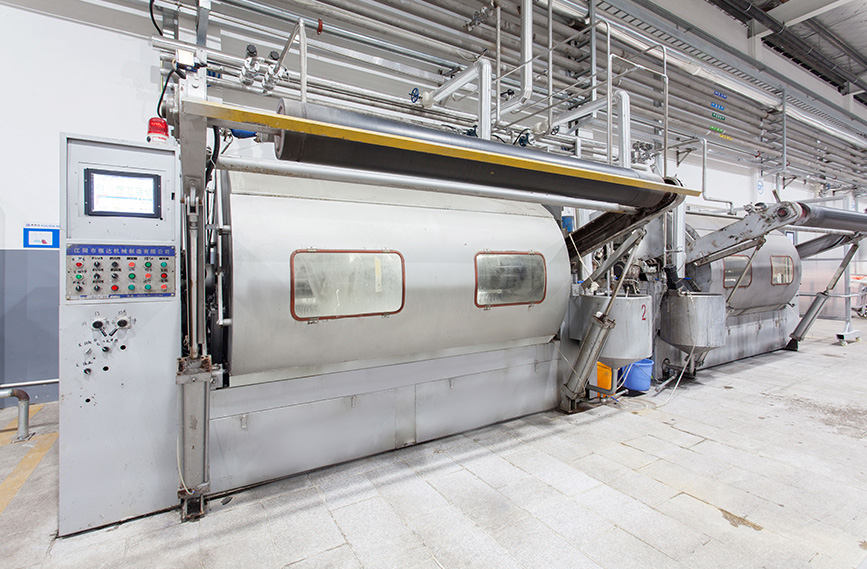 配备立信、亚东、高勋等气流缸、溢流缸、经轴缸、卷染缸等各类型染缸300多台,并全部采用韩国进口的染料助剂自动计量和输送系统。