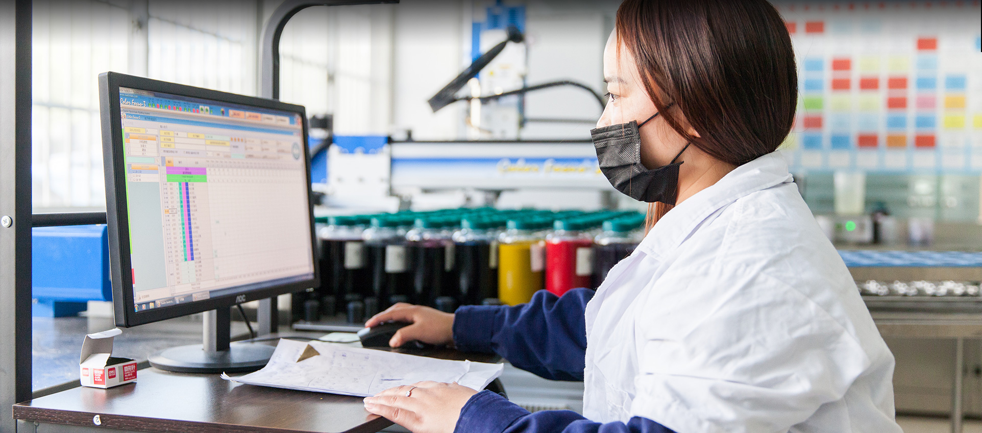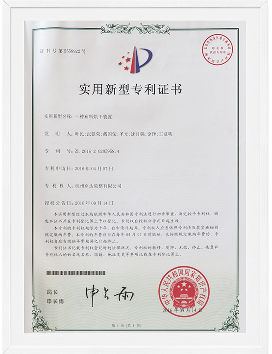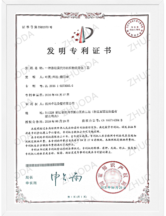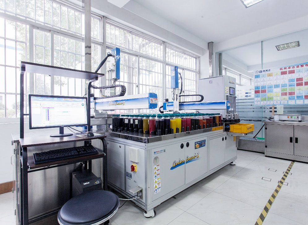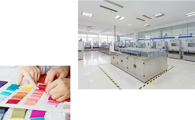 本公司研发中心拥有先进的研发设备和硬件设施,具有雄厚的研发实力。打样设备全套引进韩国实验室设备,建立了化验仿色系统,利用计算机测配色,建立强大的数据库以快速准确地仿色、拟出配方,交由自动化料、滴液设备进行染液配制,最后将样品和配制好的染色液送入全自动小样机中模拟车间生产,制出布样。经确认后,该配方再交由生产部组织大货生产。